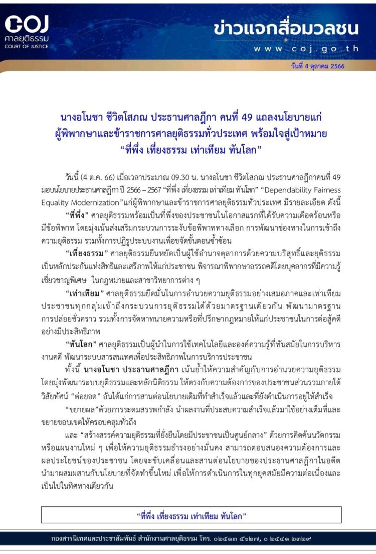 นางอโนชา ชีวิตโสภณ ประธานศาลฎีกา คนที่ 49 แถลงนโยบายแก่ ผู้พิพากษาและข้าราชการศาลยุติธรรมทั่วประเทศ พร้อมใจสู่เป้าหมาย “ที่พึ่ง เที่ยงธรรม เท่าเทียม ทันโลก”