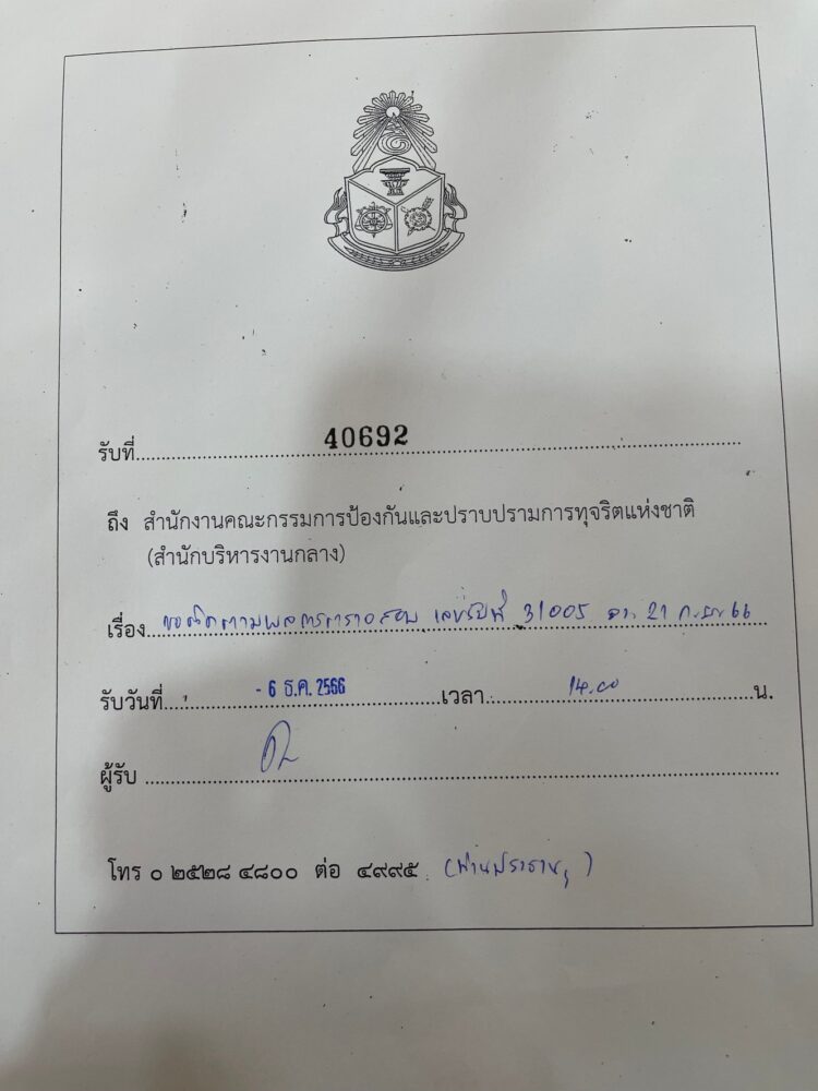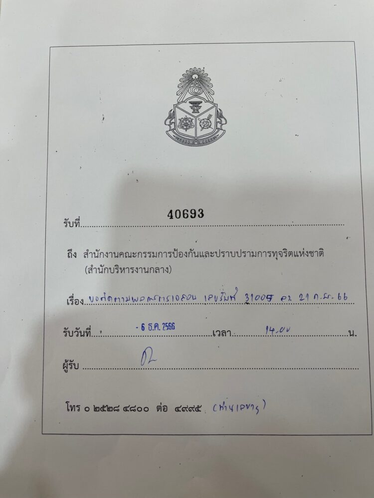 ต่อมาวันที่ 6 ธันวาคม 2566 นายวัชระ เพชรทอง อดีต สส.พรรคประชาธิปัตย์ เดินทางไปที่ สำนักงานคณะกรรมการป้องกันและปราบปรามการทุจริตแห่งชาติ ถ.นนทบุรี ต.ท่าทราย อ.เมืองนนทบุรี จ.นนทบุรี เพื่อยื่นหนังสือร้องเรียน ต่อ พลตำรวจเอกวัชรพล ประสานราชกิจ ประธานกรรมการ ป.ป.ช. และ นายนิวัติไชย เกษมมงคล เลขาธิการคณะกรรมการ ป.ป.ช. ผ่าน นายธนิต สุวรรณกาศ นักสืบสวนคดีทุจริตชำนาญการพิเศษ สำนักสืบสวนคดีทุจริต เพื่อขอติดตามผลการตรวจสอบการส่อทุจริตในการปฏิบัติหน้าที่ของคณะกรรมการตรวจรับพัสดุและผู้ควบคุมงาน โครงการก่อสร้างดังกล่าว กับพวกและขอให้ดำเนินการสอบสวนลงโทษตามกฎหมายของ ป.ป.ช.