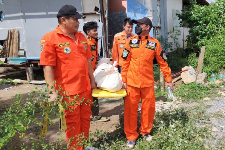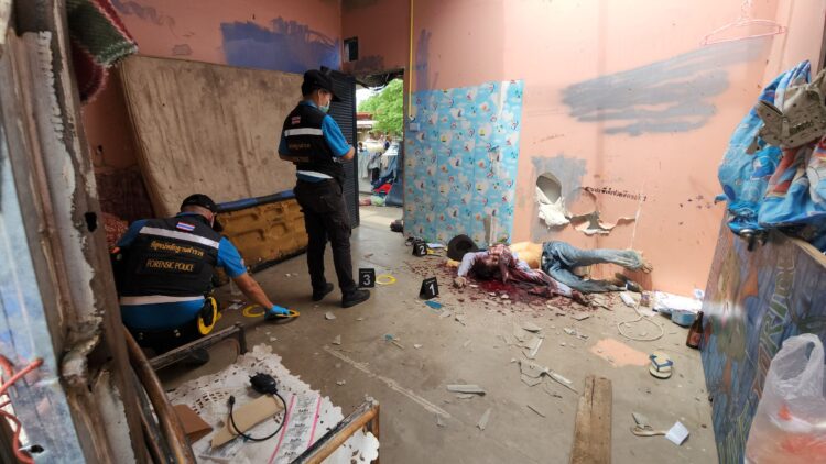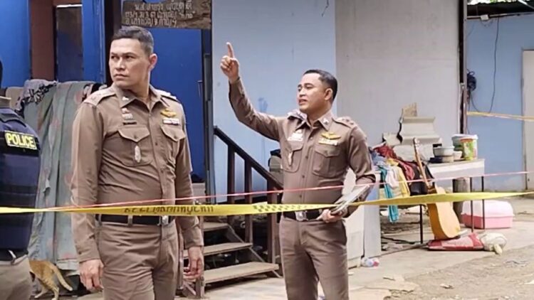 ที่เกิดเหตุเป็นบ้านชั้นเดียวแบบยกพื้นขึ้น พบว่ามีชาวบ้านมารวมตัวกันเป็นจำนวนมาก เจ้าหน้าที่ตำรวจได้กั้นบริเวณที่เกิดเหตุไว้ และได้สอบปากคำ ผู้ที่อยู่คือเห็นเหตุการณ์ โดยบนบ้านหลังดังกล่าว ที่บริเวณช่องทางเดินทางบ้านพบผู้เสียชีวิตทราบชื่อคือ นายบุญมี อยู่เอี่ยม หรือดำ อายุ 59 ปี อดีตผู้ใหญ่บ้าน ที่อยู่ 163/1 หมู่ 16 ต.ดอนแสลบ อ.ห้วยกระเจา จ.กาญจนบุรี เสียชีวิตในลักษณะที่ห้อยหัวลงมา ขาเกี่ยวกับคานหลังคาบ้าน เป็นภาพที่สยดสยองมาก ส่วนผู้บาดเจ็บอีก 1 รายทราบชื่อ นายธนพล หงษ์เวียงจันทร์ หรือเอ อายุ 19 ปี ที่อยู่ 126 หมู่ 1 ต.หนองประดู่ อ.เลาขวัญ จ.กาญจนบุรี ถูกยิงเข้าที่หัวไหล่และแขน โดยชาวบ้านได้นำตัวส่งโรงพยาบาลเลาขวัญ และถูกส่งตัวไปผ่าตัดที่โรงพยาบาลพหลพลพยุเสนา อาการพ้นขีดอันตรายแล้ว ส่วนผู้ก่อเหตุทราบชื่อคือ นายสุทัศน์ ทองยิ้ม หรือทัด อายุ 30 ปี ที่อยู่ 95 ม.1 ต.หนองประดู่ อ.เลาขวัญ จ.กาญจนบุรี พร้อมด้วยอาวุธปืนขนาด 9 มม.เดินหลบอยู่ในหมู่บ้านถูกเจ้าหน้าที่ตำรวจชุดสืบสวน สภ.เลาขวัญ ตามจับกุมตัวมาได้แล้วควบคุมตัวมาสอบสวนที่ สภ.เลาขวัญ