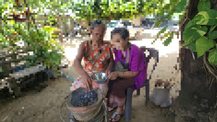 เมื่อเวลา 09.30 น.วันที่ 7 กรกฏาคม 2567 ผู้สื่อข่าวไปพบกับ นางสมบูรณ์ เจริญพร อายุ 73 ปี และนางนารี สารทเวช อายุ 73 ปี ชาวตำบลม่วงชุม อำเภอท่าม่วง จังหวัดกาญจนบุรี หลังได้รับการร้องเรียนขอความช่วยเหลือจากความเดือดร้อนปัญหาเรื่องที่ดิน โดยพบว่าทั้งสองคนกำลังทำพิธีเอาพริกเอาเกลือมาเผาในเตาถ่านที่ไฟกำลังลุกไหม้เพื่อเป็นการระบายความคับแค้นใจ และสาปแช่งกลุ่มนายทุน ที่เข้ามาบุกรุกยึดที่ดินบรรพบุรุษของครอบครัวตนเองไปอย่างหน้าตาเฉย แถมยังมีการเข้าไปปลูกสร้างร้านกาแฟและเปิดเป็นลานกางเต้นท์ให้บริการกับนักท่องเที่ยวอย่างใหญ่โตเป็นล่ำเป็นสัน ทั้งที่ที่ดินแปลงดังกล่าว ซึ่งมีเนื้อที่ประมาณ 3 ไร่ เป็นที่ดินที่พวกตนได้รับต่อมาจากบรรพบุรุษ