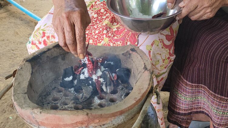 ในระหว่างที่เอาพริกเอาเกลือเผาไฟอยู่นั้น นางนารี และนางสมบูรณ์ ได้พูดว่า ใครเอาที่ดินปู่ย่าตายายกูไปขอให้ชิบหายตายจาก ให้มันไหม้เหมือนที่เราเผา ขอให้เป็นเหมือนพริกเกลือในกองไฟ ขอให้ล้มหายตายจากใครเอาไปก็แล้วต่อ ขอให้เวรกรรมตามทัน ขอให้เป็นตามพริกเกลือในกองไฟ มึงเอาของกูคืนมามึงโกงของกูไปนานแล้ว