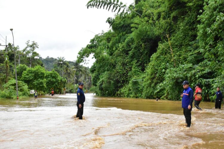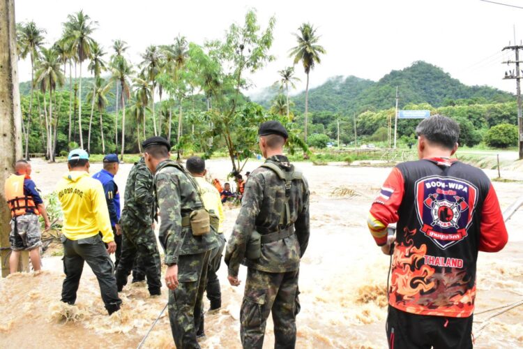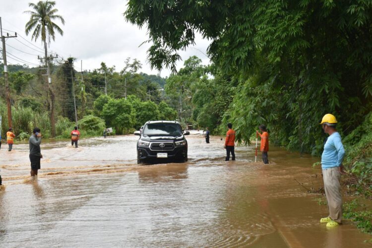 วันนี้ 25 ก.ค.67 ผู้สื่อข่าวรายงานว่า นายอธิสรรค์ อินทร์ตรา รองผู้ว่าราชการจังหวัด ปฏิบัติราชการแทนผู้ว่าราชการจังหวัดกาญจนบุรี/ผู้อำนวยการจังหวัด กล่าวว่า คืนที่ผ่านมาฝนได้ตกลงมาในพื้นที่อำเภอทองผาภูมิ ตลอดทั้งคืน ทำให้น้ำป่าไหลหลากเข้าท่วมถนนทางหลวง 323 สายทองผาภูมิ-สังขละบุรี บริเวณด้านหน้าหน่วยพัฒนาการเคลื่อนที่ 11 สำนักงานพัฒนาภาค 1 หน่วยบัญชาการทหารพัฒนา (นพค.11)ต.ท่าขนุน อ.ทองผาภูมิ จ.กาญจนบุรี ระยะทางประมาณ 2 กิโลเมตร ระดับน้ำท่วมอยู่ที่ประมาณ 20-50 เซนติเมตร ส่วนกระกระแสน้ำค่อนข้างไหลเชี่ยว รถเล็กไม่สามารถสัญจรผ่านไปมาได้ ส่วนรถขนาดใหญ่ต้องใช้ความระมัดระวัง