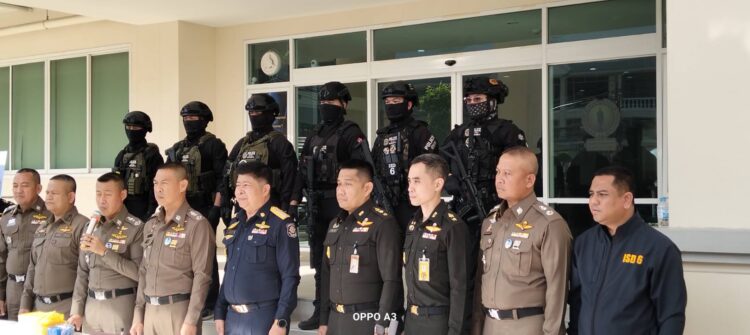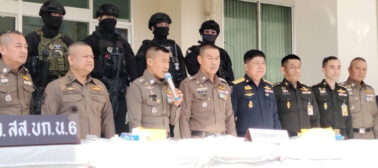 พล.ต.ท.สำราญ นวลมา ผู้ช่วย ผบ.ตร. พร้อมด้วย พล.ต.ท.สยาม บุญสม รรท.ผบช.น. และเจ้าหน้าที่ตำรวจที่เกี่ยวข้อง ร่วมแถลงข่าวจับกุมผู้ค้ายาเสพติดรายสำคัญ เพื่อสกัดกั้นไม่ให้ยาเสพติดเล็ดลอดเข้าไปสู่ชุมชน