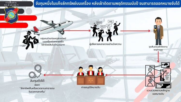 ภายใต้การอำนวยการ พล.ต.ท.ศักย์ศิรา เผือกอ่ำ ผบช.ทท. พร้อมด้วย พล.ต.ต.พงษ์สยาม มีขันทอง รอง ผบช.ทท., พล.ต.ต.ม.ล.สันธิกร วรวรรณ ผบก.ทท.1, พ.ต.อ.พงษ์พิเชษฐ์ นิลจันทร์ ผกก.3 บก.ทท.1 แถลงผลการปฏิบัติงาน ” ตำรวจท่องเที่ยว กก.3 บก.ทท.1 (ท่าอากาศยานสุวรรณภูมิ) “จับกุมแก๊งลักทรัพย์ผู้โดยสารบนเครื่องบิน” หลังเฝ้าติดตามพฤติกรรมนับปี