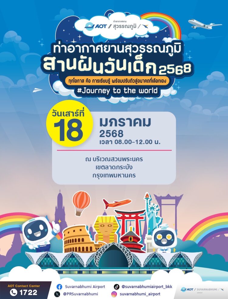 วันที่ 9 มกราคม 2568 ท่าอากาศยานสุวรรณภูมิ (ทสภ.) ขอเชิญชวนผู้ปกครองทุกท่านพาบุตรหลานเข้าร่วมกิจกรรมวันเด็ก ประจำปี 2568 ที่บูธกิจกรรมของ ทสภ. ซึ่งจัดขึ้น 2 วัน โดยมีรายละเอียด ดังนี้