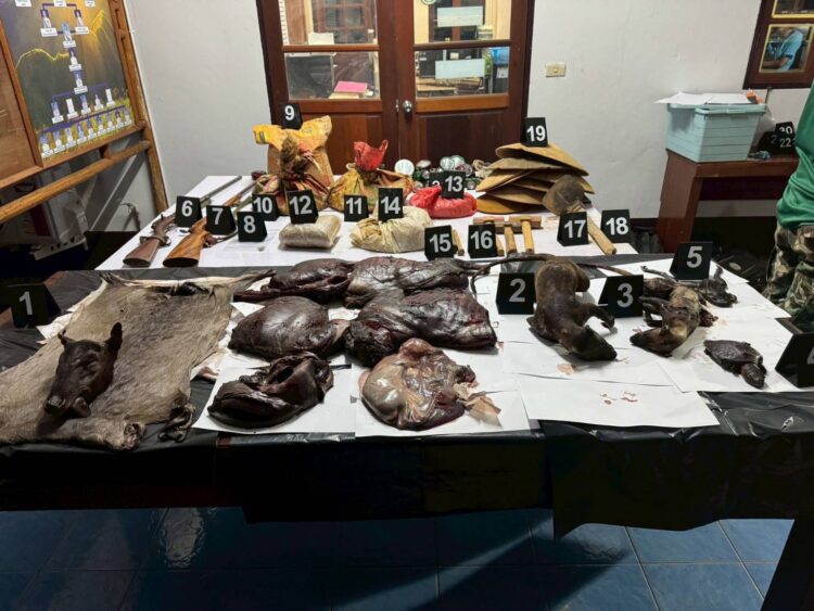 ของกลางที่ตรวจยึดเป็นอุปกรณ์และซากสัตว์ป่าที่มีไว้หรือได้ใช้ในการกระทำผิด จำนวนมากถึง 24 รายการ ประกอบด้วย