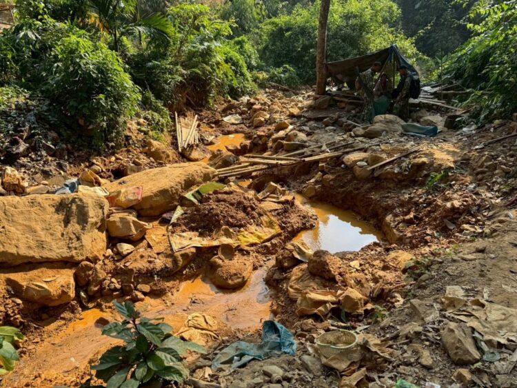ดังนั้นจึงกระจายกำลังออกตรวจพื้นที่จากการดักซุ่ม ได้ยินเสียงพูดคุยกันมีทั้งหญิงและชายจำนวนมาก แต่เนื่องจากห้วงเวลาดังกล่าวท้องฟ้ายังมืดอยู่ จึงจำเป็นต้องซุ่มรอให้ถึงรุ่งสางจนกระทั่งมีแสงสว่างจากดวงอาทิตย์ ทำให้มองเห็น พบว่ามีการบุกรุกขยายเปิดพื้นที่โดยการขุดดิน หลุมขนาด 1X1 เมตร ลึก 10 – 15 เมตร ซึ่งมีร่องรอยการขุดดินสภาพใหม่ เป็นจำนวนมาก ตรวจสอบมีรองรอยการคัดเลือกดิน หิน ที่มีแร่ทองคำ ชักลากลงไปในลำห้วยอีกด้วย