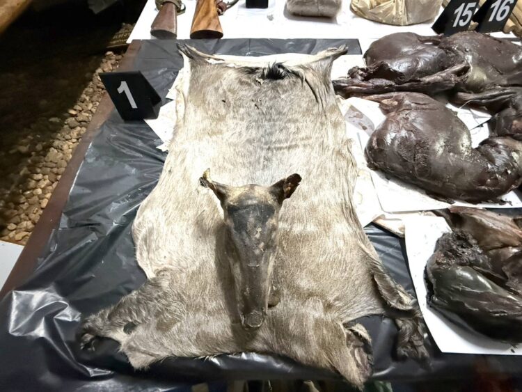 1. ซากเก้งหม้อ เพศเมีย จำนวน 1 ตัว น้ำหนักรวม 17.4 กิโลกรัม 2. ซากอีเห็นธรรมดา จำนวน 2 ตัว น้ำหนักรวม 4.8 กิโลกรัม 3. ซากกบทูด จำนวน 1 ตัว น้ำหนักรวม 0.6 กิโลกรัม 4. ซากตะพาบน้ำ จำนวน 1 ตัว น้ำหนักรวม 0.6 กิโลกรัม