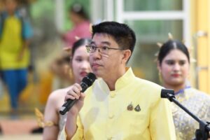 ครั้งที่ ๒๓ ประจำปี ๒๕๖๘” ร้อยตรียุทธภูมิ จับจิตต์ นายอำเภอบางกรวย กล่าวรายงาน ประเพณีหล่อเทียนและแห่เทียนพรรษาทางน้ำของอำเภอ