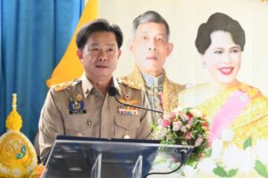 โดยผู้ว่าราชการจังหวัดนนทบุรีเดินทางมาถึง ได้เปิดกรวยกระทงดอกไม้เบื้องหน้าพระบรมฉายาลักษณ์ พระบาทสมเด็จพระเจ้าอยู่หัว และสมเด็จพระนางเจ้าสิริกิติ์ พระบรมราชินีนาถ พระบรมราชชนนีพันปีหลวง จากนั้นได้กล่าวน้อมสำนึกในพระมหากรุณาธิคุณฯ ที่ทรงพระราชทานทรัพย์ส่วนพระองค์ ก่อตั้งโครงการน้ำพระทัยพระราชทานเพื่อเลี้ยงอาหารแก่ผู้ตกทุกข์ได้ยากมาเป็นระยะเวลา 26 ปี นับถึงปัจจุบัน ทั้งชื่นชมสภาสังคมสงเคราะห์แห่งประเทศไทย ที่ได้ร่วมกับหน่วยงานต่างๆ ในส่วนภูมิภาค จัดโครงการน้ำพระทัยพระราชทานเพื่อเฉลิมพระเกียรติ พระบาทสมเด็จพระเจ้าอยู่หัว และสมเด็จพระนางเจ้าสิริกิติ์ พระบรมราชินีนาถ พระบรมราชชนนีพันปีหลวง โดยจังหวัดนนทบุรีได้จัดเลี้ยงอาหาร มอบเครื่องอุปโภคบริโภคแก่นักเรียนในครอบครัวเปราะบาง ณ โรงเรียนประชาบดี อำเภอปากเกร็ด จังหวัดนนทบุรี