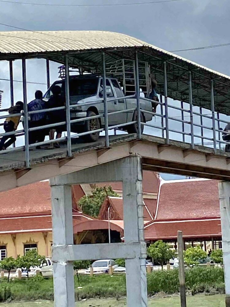 วันที่ 7กันยายน 2568 นายวัชรเกรียติ์ สีนวลจันทร์ ผู้ใหญ่บ้านหมู่5 โคกขาม อำเถอเมือง จังหวัดสมุทรสาครได้เปิดเผยกับผู้สื่อข่าวว่าได้รับแจ้งจากลูกบ้านว่ามีรถกระบะมีคอก ติดบนสะพานหน้าวัดบ้านขอม ซึ่งเป็นสะพานสำหรับให้คนเดิน และรถจักรยานยนต์วิ่งข้าม ไปวัดสู่ถนนเจษฎาวิถี ซึ่งไม้ได้สร้างให้รถยนต์ข้าม