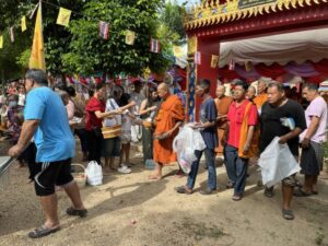 วันที่ 8ตุลาคม 2568 เวลา 09.00 น. พระใบฏีกา วินิจ สมจิตโต (เจ้าอาวาส) วัดโพธิ์ศรีสุขาราม ตำบลวังศาลาอำเภอท่าม่วง จังหวัดกาญจนบุรีพร้อมพระลูกวัดที่จำพรรษา 15องค์ได้ร่วมออกรับบิณฑบาตรข้าวสารอาหารแห้งจากพุทธศาสนิกชนชาวบ้านตำบลวังศาลาอำเภอท่าม่วง และใกล้เคียง ที่มาร่วมทำบุญเนื่องในวันออกพรรษา ประจำปี 2568ซึ่งในปีนี้ ทางวัดกำหนดจัดงาน ทำบุญจำนวน 3วัน คือ ระหว่างวันที่ 6-7และ วันที่ 8ตุลาคม 2566 ซึ่งในช่วงเช้าของวันนี้เวลา 09.00 น. เป็นการตักบาตรเทโวโรหณะโดยมี พุทธศาสนิกชนที่เดินทางมาร่วมบุญกันเป็นจำนวนมากต่างพร้อมใจกันแต่งกายด้วยชุดผ้าไทยหลากหลายสีสันพร้อมตั้งโต๊ะนำข้าวสารอาหารแห้งมาร่วมใส่บาตรพระสงฆ์ที่มาร่วมรับบิณฑบาต ตามประเพณีวันออกพรรษาที่ถือปฏิบัติสืบทอดกันมาเป็นเวลานับร้อยปี นอกจากนี้ ชาวบ้านที่มาทำบุญแต่ละชุมชนยังมีการคัดเลือกตัวแทนซึ่งจะเป็นบรรดาเด็กๆ และสาวแรกรุ่นที่มีหน้าตา อ่อนหวานงดงามมาแต่งกายด้วยชุดนางฟ้าเดิน ถือพุ่มเงินที่นำมาร่วมบุญกับทางวัดเดินนำหน้าพระสงฆ์ที่ออกบิณฑบาตข้าวสารอาหารแห้ง เพื่อรับเงินทำบุญจากผู้มีจิตศรัทธาที่มาร่วมทำบุญตักบาตรเทโวโรหณะหลังจากพระสงฆ์ได้เดินออกบิณฑบาตรข้าวสารอาหารแห้งเสร็จแล้วจึงเข้ามาในศาลาการเปรียญเพื่อฉันอาหารเช้าที่พุทธศาสนิกชนนำมาทำบุญเนื่องในเทศกาลวันออกพรรษา หลังจากนั้นนางฟ้าทั้ง 16คนได้เดินเข้ามาในศาลาการเปรียญและมอบพุ่มเงินที่ได้จากการเดินนางฟ้าถวายให้พระใบฎีกาวินิจ สมจิตโต