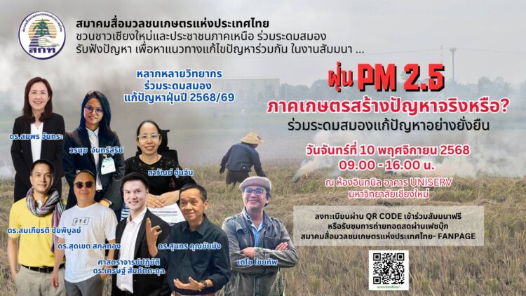 สมาคมสื่อมวลชนเกษตรแห่งประเทศไทย ขอเชิญชวนชาวจังหวัดเชียงใหม่ และพี่น้องภาคเหนือ เข้าร่วมสัมมนาและแสดงความคิดเห็น “ฝุ่น PM 2.5 ภาคเกษตรสร้างปัญหาจริงหรือ มาร่วมระดมสมองเพื่อการแก้ไขปัญหาอย่างยั่งยืน” ในวันจันทร์ที่ 10 พฤศจิกายน 2568 เวลา 8.30 – 16.00 น. ที่ห้องอินทนิล อาคาร UNISERV มหาวิทยาลัยเชียงใหม่ ถนนนิมมานเหมินท์