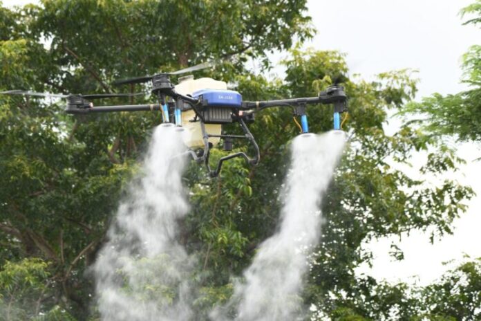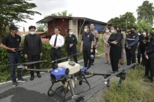 ทดลอง) โดยใช้อากาศยานไร้คนขับ (โดรน) พร้อมด้วยนางระวีพรรณ แก้วเพียงเพ็ญ รองผู้ว่าราชการจังหวัดนนทบุรี นางสาวสะอาด พิมพ์สมบูรณ์ นายอำเภอไทรน้อย นายอาภากร สนิกะวาที ผู้อำนวยการโครงการชลประทานนนทบุรี และนายณัฏฐพร จันทร์แก้ว นายกเทศบาลตำบลไทรน้อย เข้าร่วม