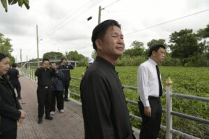 เกียรติศักดิ์ ตรงศิริ ผู้ว่าราชการจังหวัดนนทบุรี หัวหน้าคณะรับชมการทดลองการนำสารชีวภาพ “สวพ.62-RID No.1” มาใช้ในการพัฒนาฟื้นฟูและแก้ปัญหาแหล่งน้ำในพื้นที่จังหวัดนนทบุรี (พื้นที่