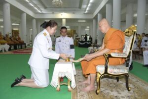 ไทยธรรม พร้อมทอดผ้าไตรบังสุกุลจำนวน 4 ผืน แด่พระสงฆ์ในการประกอบพิธีบังสุกุล หลังเสร็จสิ้นพิธีกรรมทางสงฆ์ ประธานกรวดน้ำ รับพร ก่อนกราบลาพระรัตนตรัย กราบลาพระสงฆ์และถวายความเคารพพระฉายาลักษณ์สมเด็จพระนางเจ้าสิริกิติ์พระบรมราชินีนาถ พระบรมราชชนนีพันปีหลวงเป็นอันเสร็จพิธี