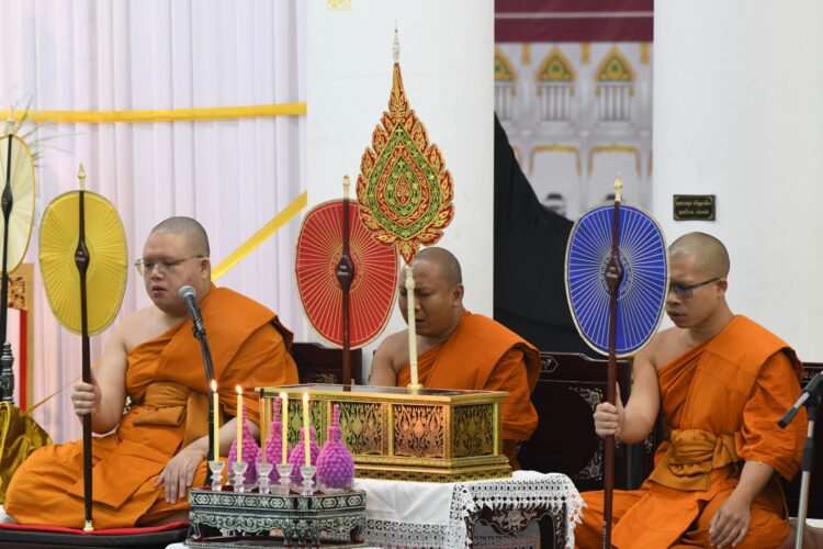ประธานทอดผ้าไตรบังสุกุล พระสงฆ์สดับปกรณ์ พระสงฆ์ทั้งนั้นอนุโมทนา ประธานและผู้มีเกียรติกรวดน้ำรับพร จากนั้น ประธานในพิธีจุดธูปเทียนบนกระบะมุกหน้าตู้พระธรรม พระพิธีธรรมสวดพระอภิธรรมทำนองหลวง 4 จบ ผู้มีเกียรติร่วมถวายเครื่องไทยธรรม ประธานทอดผ้าไตรบังสุกุล พระพิธีธรรมสดับปกรณ์ พระสงฆ์ทั้งนั้นอนุโมทนา ประธานและผู้มีเกียรติกรวดน้ำรับพร ต่อจากนั้นประธานกราบลาพระรัตนตรัย กราบลาและถวายความเคารพเบื้องหน้าพระฉายาลักษณ์ กราบลาประธานสงฆ์เป็นอันเสร็จพิธี