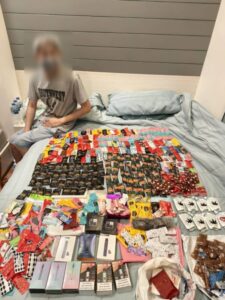 ไฟฟ้าผสมเอโทมิเดตหรือพอตเค) โดยมีไว้เพื่อจำหน่าย อันเป็นการกระทำเพื่อการค้า ,มียาเสพติดให้โทษประเภท 1( ยาอี ) ไว้ในความครอบครองโดยไม่ได้รับอนุญาต, มียาเสพติดให้โทษประเภท 2 ( โคเคน ) ไว้ในความครอบครองโดยไม่ได้รับอนุญาต, มีวัตถุออกฤทธิ์ต่อจิตและประสาทประเภท 2 ( หัวน้ำยาบุหรี่ไฟฟ้าผสมเอโทมิเดตหรือพอตเค ) ไว้ในครอบครองโดยไม่ได้รับอนุญาต และซ่อนเร้น ช่วยจำหน่าย ช่วยพาไปเสีย ซื้อ รับจำนำ หรือรับไว้โดย