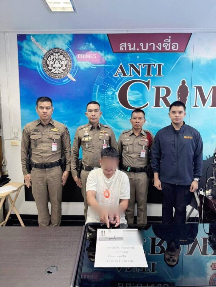 วันที่ 24 พฤศจิกายน 2568 เวลาประมาณ 13.00 น.ภายใต้การอำนวยการของ พ.ต.อ.สนอง แสงมณี ผกก.สน.บางซื่อ มอบหมายให้ พ.ต.ท.วรภัทร สุขไทย รอง ผกก.ป.สน.บางซื่อ นำกำลังสายตรวจชุดที่ 2 พร้อม พ.ต.ต.ณัฐวัตร์ ธงทันที สวป.สน.บางซื่อ, ร.ต.อ.คนอง ดอนเสือ รอง สวป.สน.บางซื่อ, จ.ส.ต.วิเชียร ภาษี และ ส.ต.ท.ณัฐดนัย อินทำนุ ออกปฏิบัติหน้าที่ จนสามารถจับกุมผู้ต้องหาพกอาวุธปืนเถื่อนได้คาหนังคาเขา