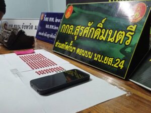 หน้าที่ควบคุมตัวไว้ได้ ทราบชื่อ นายเอกชัย ธิพรพันธ์ อายุ 29 ปี จากนั้น ชุดปฏิบัติร่วม ฯ จึงได้แสดงความบริสุทธิ์ใจก่อนทำการตรวจค้นภายในร่างกาย ผลการตรวจค้น พบถุงพลาสติกสีชมพูลักษณะกดปิดดึงเปิดประทับตราอักษร A จำนวน 1 ถุง ภายในบรรจุยาเสพติดให้โทษประเภท 1 (ยาบ้าหรือเมทแอมเฟตามีน) เม็ดสีแดง จำนวน 240 เม็ด และเม็ดสีเขียว จำนวน 4 เม็ด รวมยาบ้าทั้งสิ้น จำนวน 244 เม็ด ซุกซ่อนอยู่ภายในกระเป๋าสะพายสีน้ำตาลของนายเอกชัย ธิพรพันธ์ ฯ ที่สะพายอยู่ จนท.จึงทำการควบคุมตัวผู้ต้องหาพร้อมของกลางมายัง จึงทำการควบคุมตัวผู้ต้องหาพร้อมของกลางมายัง