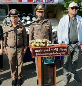 ต่อมาเวลา 09.30 น. พล.ต.ต.พศวีร์ เรืองภู่ ผู้บังคับการตำรวจภูธรจังหวัดกาญจนบุรี เดินทางมาเป็นประธานในพิธี โดยเด็กนักเรียนและประชาชนยืนเข้าแถวให้การต้อนรับ จากนั้นผู้กำกับการสถานีตำรวจภูธรเมืองกาญจนบุรี กล่าวรายงานต่อประธาน ก่อนที่ประธานจะให้โอวาทและกล่าวเปิดโครงการอย่างเป็นทางการ