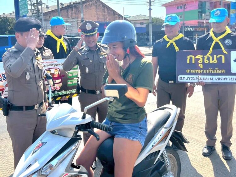 วันที่ 31 ธ.ค.68 ที่บริเวณจุดอำนวยความสะดวกให้กับประชาชน บริเวณหน้าปั้มน้ำมันถนนพุทธสาคร สวนหลวง อำเภอกระทุ่มแบนจังหวัดสมุทรสาคร พ.ต.ท.อาคม ตาใคร้ สารวัตรจราจร สถานีตำรวจภูธรกระทุ่มแบน ได้เปิดเผยกับผู้สื่อข่าวว่า ได้มีการแจกหมวกนิรภัยฟรี ให้กับผู้ใช้รถจักรยานยนต์ นำโดยพ.ต.อ.พศพงศ์ มณฑา