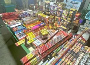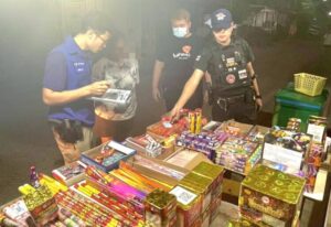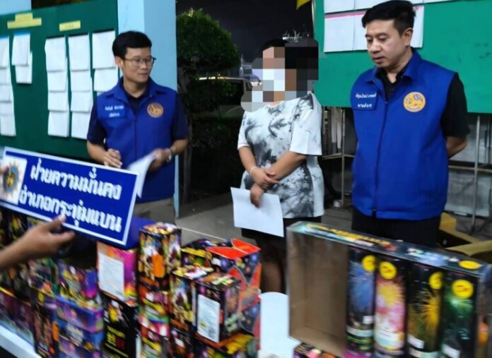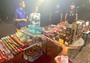 จึงรีบนำกำลังเข้าไปตรวจพบ นางสาว สมศรี กำลังขายดอกไม้ไฟ พลุหลากหลายชนิด รวมมากกว่า 1,000 ชิ้น ประกอบด้วย พลุแบบกล่อง จำนวน 43 กล่อง พลุแบบห่อ จำนวน 53 แพ็ค พลุแบบแท่ง จำนวน 40 แท่ง วี๊ดบี้มส์ ปั้งจำนวน 6 แพ็ค พลุทองคำเล็กอีกจำนวน 11 กล่อง