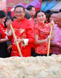 เพชรบุรี ประธานสหสมาคมมูลนิธิชาวจีนเพชรบุรี พร้อมคณะผู้บริหารเทศบาลเมืองเพชรบุรี ผัดหมี่ซั่วกระทะยักษ์ แจกจ่ายให้ผู้มาร่วมงานเพื่อความเป็นสิริมงคลตามความเชื่อหากได้รับประทานผัดหมี่ซั่ว ในวันตรุษจีนอายุจะยืนยาว จากนั้น ได้ร่วมสักการะเทพเจ้า เจ้าแม่กวนอิม เทพเจ้ากวนอู เทพเจ้าไฉ่ซิงเอี๊ย เทพเจ้าไท้ส่วยเอี๊ย และพระสังกัจจาย เพื่อขอพรความเป็นศิริมงคล ท่ามกลางนักท่องเที่ยว และประชาชนชาวไทยเชื้อสายจีนเข้าร่วมงาน จำนวนมาก