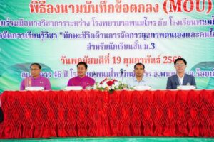 ภายในพิธีมี นิสิต บุญอะรัญ ผู้อำนวยการโรงพยาบาลพนมไพร มอบหมายให้ ภาสกร รัตนเดชสกุล รองผู้อำนวยการโรงพยาบาลพนมไพร ปฏิบัติราชการแทน ร่วมลงนามกับ อนุสรณ์ ทาสระคู ผู้อำนวยการโรงเรียนพนมไพรวิทยาคาร โดยมี วิชัย พลสะทอน สาธารณสุขอำเภอพนมไพร คณะวิทยากร “คุณครูพี่หมอ” จากโรงพยาบาล คณะครู และนักเรียน เข้าร่วมเป็นสักขีพยาน