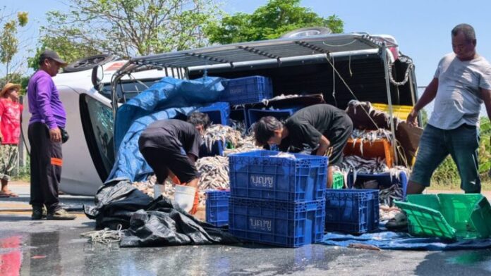 ภูธรสัตหีบ ได้รับแจ้งเหตุรถกระบะบรรทุกปลาพลิกคว่ำ ภายในพื้นที่ช่องแสมสาร อำเภอสัตหีบ จังหวัดชลบุรี หลังรับแจ้งจึงประสานเจ้าหน้าที่เข้าตรวจสอบที่เกิดเหตุ