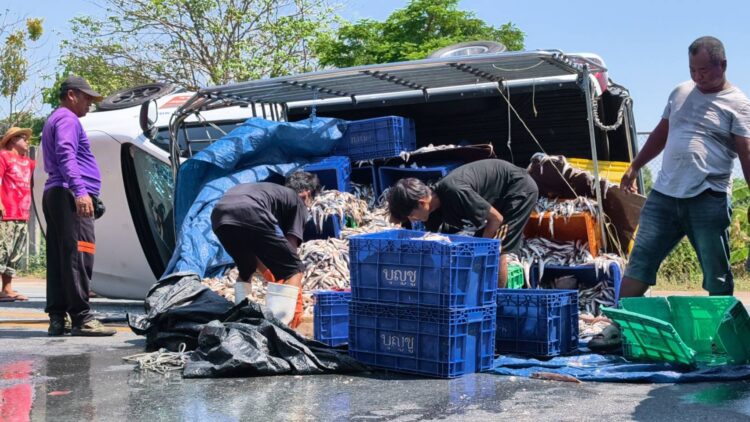 ในที่เกิดเหตุ พบรถกระบะ ทะเบียน ผธ 3242 นครปฐม พลิกคว่ำตะแคงข้างอยู่บนผิวการจราจร สภาพรถได้รับความเสียหาย โดยมีปลาที่