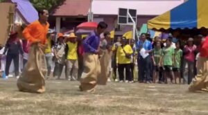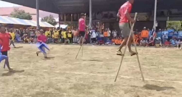 บรรยากาศการแข่งขันเป็นไปอย่างสนุกสนาน เรียกเสียงหัวเราะลั่นสนามมีการแข่งขันเดินไม้โถกเถกโดยผู้เล่นจะขึ้นไปยืนบนไม้โถกเถกเอามือจับไม้ไผ่ให้มั่นคงใช้เท้าเหยียบที่พักเท้า และใช้เท้าคีบไม้ไผ่ไว้เพื่อช่วยในการทรงตัว เดินหรือวิ่งแข่งกัน โดยพยายามไม่ให้ตกลงมา ใครถึงเส้นชัยก่อนหรือเดินได้นานที่สุดโดยไม่ตกเป็นผู้ชนะ เรียกได้ว่าลุ้นกันทุกวินาทีมีผู้ช่วยวิ่งถือเก้าอี้รอรับลงจากไม้ การแข่งวิ่งกระสอบที่ผู้เข้าแข่งขันต่างล้มลุกคลุกคลาน