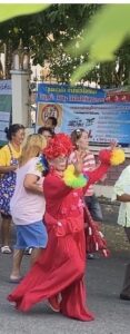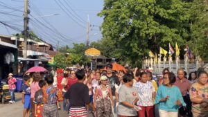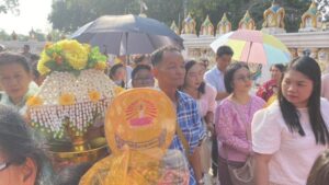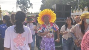 และในวันนี้วันที่ 5 เมษายน 2569 บรรยากาศกลับมาคึกคักอีกครั้ง กับขบวนแห่นาคสุดยิ่งใหญ่ แม้อากาศจะร้อนอบอ้าว แต่ผู้ร่วมงานต่างร่วมสนุกกันอย่างเต็มที่มีขบวนนางรำในชุดแฟนตาซีสุดตระการตา โดยเฉพาะ “เจ๊โต” วัย 57 ปี ที่มาในชุดสีแดงประดับขนนกสีสันสดใส โดดเด่นราวกับนางฟ้าแห่งขบวนแห่ เจ้าตัวเผยว่า ชื่นชอบงานรื่นเริงและการแต่งกายแนวนี้อยู่แล้ว จึงตั้งใจมาร่วมสร้างสีสันให้กับงานบุญครั้งนี้ และยังมีคุณยายในชุดดอกไม้ทานตะวัน ที่ช่วยเรียกรอยยิ้มจากผู้ร่วมงานตลอดเส้นทาง โดยขบวนแห่เคลื่อนจากวัดศาลาการเปรียญหัวสำโรง มุ่งหน้าไปสู่โบสถ์ ท่ามกลางเสียงดนตรีจากรถแห่หน้าหัวสำโรงสัมพันธ์ ที่สร้างความครึกครื้นตลอดสาย แม้แดดจะแรงเพียงใด แต่ทุกคนก็ไม่ยอมแพ้ ต่างพากันเต้นรำอย่างสนุกสนานไม่มีแผ่ว