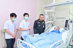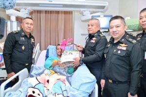 พร้อมกันนี้ ได้สอบถามอาการของกำลังพลและครอบครัวอย่างใกล้ชิด โดยได้เข้าเยี่ยมกำลังพลที่ได้รับบาดเจ็บจากแรงระเบิดและการปะทะที่เข้ารับการรักษาหลายราย ณ อาคารเฉลิมพระเกียรติ สมเด็จพระนางเจ้าสิริกิติ์ พระบรมราชินีนาถ ทั้งในหอผู้ป่วยศัลยกรรมพิเศษและหอผู้ป่วยวิกฤต อาทิ ร้อยเอก ณัฐพล ทองแดง ร.2 พัน.1/กองทัพภาคที่ 1 มีภาวะติดเชื้อและลิ้นหัวใจอักเสบจากการปฏิบัติ