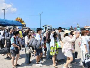 วันนี้ (11 เม.ย.69) ซึ่งเริ่มเป็นวันหยุดติดต่อยาวหลายวันเทศกาลสงกรานต์ ผู้สื่อข่าวได้เดินทางไปสำรวจการท่องเที่ยวที่ท่าเรือโดยสารเกาะลอย-เกาะสีชัง อำเภอศรีราชา จังหวัดชลบุรี พบว่ามีนักท่องเที่ยวทั้งในพื้นที่และใกล้เคียงจังหวัดชลบุรี เริ่มพากันเดินทางมาซื้อตั๋วเพื่อนั่งเรือข้ามไปพักผ่อนและท่องเที่ยวที่เกาะสีชัง เป็นจำนวนมาก โดยมี