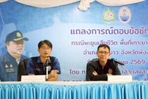 (วันนี้ 12 เมษายน 2569) เวลา 13.00 น. ที่ ห้องประชุมอุทยานแห่งชาติสิรินาถ หาดในยาง ตำบลสาคู อำเภอถลาง จังหวัดภูเก็ต นายสุชาติ ชมกลิ่น รมว. ทรัพยากรธรรมชาติและสิ่งแวดล้อม มอบหมายให้ นายเผด็จ ลายทอง รองปลัดกระทรวงทรัพยากรธรรมชาติและสิ่งแวดล้อม พร้อมด้วย ดร.ปิ่นสักก์ สุรัสวดี อธิบดีกรมทรัพยากรทางทะเลและชายฝั่ง ติดตามความคืบหน้าพร้อมแถลงข่าวกรณีพบซากพะยูนเกยตื้นและถูกลักลอบตัดส่วนหัว ในพื้นที่อ่าวท่าเขา ตำบลเกาะยาวน้อย อำเภอเกาะยาว จังหวัดพังงา