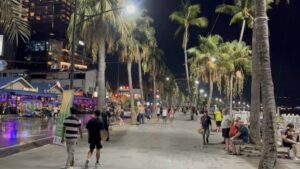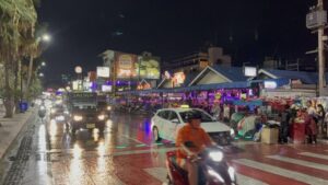 ตลอดแนวถนนเลียบชายหาดระยะทางเกือบ 1 กิโลเมตร มีนักท่องเที่ยวกระจุกตัวหนาแน่น สะท้อนถึงความนิยมของเทศกาลสงกรานต์ในพื้นที่ ซึ่งยังคงเป็นจุดหมายสำคัญของนักท่องเที่ยวทั้งชาวไทยและต่างชาติฃ