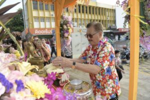 ในโอกาสนี้ นายเชษฐา โมสิกรัตน์ ผู้ว่าราชการจังหวัดนนทบุรี ได้กล่าวอวยพรเนื่องในประเพณีวันสงกรานต์และวันผู้สูงอายุแห่งชาติ โดยเน้นย้ำถึงความสำคัญของความรักความผูกพันในครอบครัวและการรักษาประเพณีอันดีงามให้สืบทอดไปสู่คนรุ่นหลัง พร้อมทั้งขอให้ผู้เข้าร่วมงานทุกท่านประสบแต่ความสุขและมีสิริมงคลในการเริ่มต้นปีใหม่ไทยอย่างปลอดภัย