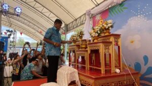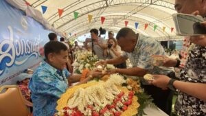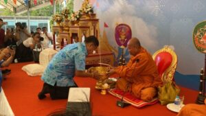 โดยได้รับความเมตตาจาก พระราชสมุทรวัชราจารย์ เจ้าคุณบุญสืบ เจ้าอาวาสวัดกลางวรวิหาร พระอารามหลวงชั้นโท เป็นประธานฝ่ายสงฆ์ นำคณะพระสงฆ์ วัดกลางวรวิหาร เจริญพระพุทธมนต์ ประพรมน้ำพระพุทธมนต์ เพื่อความเป็นสิริมงคล จากนั้น เป็นพิธีรดน้ำดำหัวขอพร จากนายกสุนทร ปานแสงทอง นายกองค์การบริหารส่วนจังหวัด