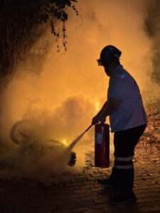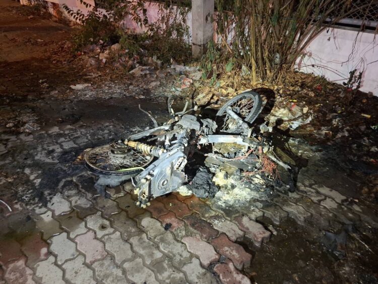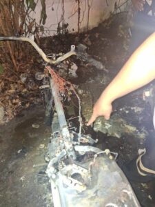 อ.เมืองนครปฐม จึงรุดไปตรวจสอบพบเจ้าหน้าที่ดับเพลิงเทศบาลนคร และมูลนิธิฯช่วยฉีดน้ำดับเพลิงเพื่อไม่ให้รุกลามอยู่ระยะหนึ่งเพลิงสงบพบซากรถจักรยานยนต์ในสภาพถูกเพลิงไหม้เสียหายทั้งคัน เหลือแต่โครงเหล็ก ตรวจพบแผ่นป้ายทะเบียนถูกเพลิงไหม้ แต่ยังพออ่านได้ว่า “ขมฉ 950 นครปฐม”จากการสอบถามเจ้าหน้าที่มูลนิธิ ทราบว่า เพลิงเริ่มลุกไหม้บริเวณช่วงกลางตัวรถ รุกลามไปยังยางล้อหลัง ต่อมารถได้ล้มลงและเกิดการระเบิดบริเวณถังน้ำมัน จากนั้นเพลิงได้รุกลามไปติดกองขยะบริเวณใกล้เคียง เจ้าหน้าที่ดับเพลิงได้ใช้น้ำฉีดระงับเหตุประมาณ 10นาที เพลิงจึงสงบ