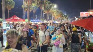 ส่วนบริเวณชายหาดตั้งแต่แยกพัทยาเหนือจนถึงทางเข้า walking street มีนักท่องเที่ยวจำนวนมากมาเล่นน้ำชายหาดกันอย่างคึกคักทั้งช่วงเวทีคอนเสิร์ต และตามบาร์เบียร์ต่างๆ ที่ตั้งจุดเล่นน้ำให้กับพนักงานและแขกที่มามาเที่ยว ส่วนตามถนน ก็จะมีนักท่องเที่ยวชาวไทยและชาวต่างชาติ เดินเล่นฉีดน้ำกันอย่างสนุกสนาน