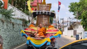 ภายในงานมีการจัดพิธีสรงน้ำพระ เพื่อความเป็นสิริมงคล พร้อมนิมนต์พระครูเกษม กิตติโสภณ หรือ “อาจารย์จ่อย” เจ้าคณะตำบลพลูตาหลวง และเจ้าอาวาสวัดสามัคคีบรรพต ตำบลบางเสร่ รวมถึงอัญเชิญรูปปั้นหลวงพ่อทองอยู่ จันทสาโร อดีตเจ้าอาวาสวัดบางเสร่คงคาราม พระเกจิชื่อดังของพื้นที่ ร่วมขึ้นขบวนแห่ บนเรือสปีดโบ๊ต ซึ่งตั้งอยู่บนสาลี่ และใช้รถยนต์ลากไป ตามถนนภายในชุมชนบางเสร่ เพื่อให้ประชาชนและนักท่องเที่ยวได้ร่วมสรงน้ำ ขอพรตลอดเส้นทาง