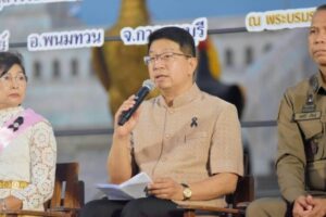 วันที่ 21 เมษายน 2569 เวลา 18.30 น. นางสาววริษฐา สงวนเสริมศรี ผู้ว่าราชการจังหวัดกาญจนบุรี มอบหมาย นายสิทธิวีร์ วรรณพฤกษ์ รองผู้ว่าราชการจังหวัดกาญจนบุรี เป็นประธานแถลงข่าว พร้อมด้วย นางสาวจรรยารักษ์ สาธิตกิจ ท่องเที่ยวและกีฬาจังหวัดกาญจนบุรี พลตำรวจตรีพศวีร์ เรืองภู่ ผู้บังคับการตำรวจภูธรจังหวัดกาญจนบุรี นายทวีป พัฒนมาศ ผู้แทนวัฒนธรรมจังหวัดกาญจนบุรี นายดำรงค์ มากระจัน พัฒนาการจังหวัดกาญจนบุรี นายสุเทพ วงศ์วัชรมงคล นายอำเภอพนมทวน และนายเอนก กาญจนแพทย์นุกูล นายกเทศมนตรีตำบลดอนเจดีย์ เข้าร่วมแถลงข่าวในครั้งนี้