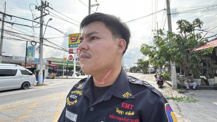 ผู้บาดเจ็บ ทราบชื่อคือ นายปัญญา คำลือจัย อายุ 27 ปี เจ้าหน้าที่กู้ภัยมูลนิธิสว่างบริบูรณ์เมืองพัทยา สภาพได้รับบาดเจ็บบริเวณลำคอ ถูกสายอินเทอร์เน็ตรัดจนเกิดบาดแผลลึกขนาดใหญ่ และบริเวณเสื้อผ้าถูกสายเกี่ยวจนขาดเป็นรอยยาว จากแรงกระชากขณะเกิดเหตุ