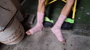 ต่อมาในช่วงเวลาประมาณ 06.00 น. ขณะตัดกิ่งไม้ ใบเลื่อยเกิดติดค้าง ตนจึงออกแรงดึงจนกิ่งไม้ขาด ส่งผลให้กิ่งไม้สะบัดอย่างแรง ทำให้เสียหลักพลัดตกจากกำแพงสูงประมาณ 4 เมตร ลงมากระแทกพื้นปูนอย่างจัง ส่งผลให้ข้อเท้าหักทั้งสองข้าง ไม่สามารถเคลื่อนไหวได้ ต้องนอนรอความช่วยเหลือราว 30 นาที ก่อนมีพนักงานมาพบและประสานกู้ภัยนำส่งโรงพยาบาล