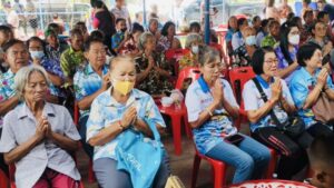 ต่อด้วยพิธีที่เปี่ยมไปด้วยรอยยิ้มและคราบน้ำตาแห่งความปิติ คือ “พิธีรดน้ำขอพรผู้สูงอายุ” เนื่องในเทศกาลสงกรานต์ นำโดย นายชูศักดิ์ พรนิมิตทรัพย์ ผู้ใหญ่บ้านหมู่ 9 พร้อมการมอบข้าวสารอาหารแห้งเพื่อเป็นขวัญและกำลังใจแก่ผู้สูงวัยในหมู่บ้าน ตอกย้ำการดูแลกันและกันของคนในชุมชนที่ “ไม่ทิ้งใครไว้ข้างหลัง”