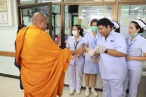 นอกจากจะส่งมอบความห่วงใยให้กับผู้ป่วยแล้ว ท่านยังเล็งเห็นถึงความทุ่มเทของเจ้าหน้าที่พยาบาลและบุคลากรทางการแพทย์ จึงได้เมตตามอบเงินขวัญถุงเพื่อเป็นสินน้ำใจและสร้างขวัญกำลังใจในการปฏิบัติหน้าที่ เพื่อให้บุคลากรทุกท่านมีพลังกายและพลังใจที่เข้มแข็ง ในการดูแลรักษาผู้ป่วยให้ได้รับการบริการทางการแพทย์อย่างดีเยี่ยมต่อไป